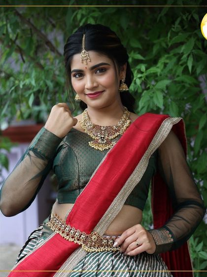 - Draping: Professional draping for party wear sarees (Chiffon, Georgette, Mysore Silk) or Lehenga Dupattas.