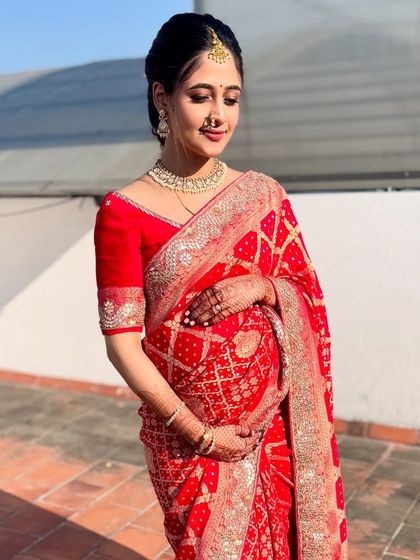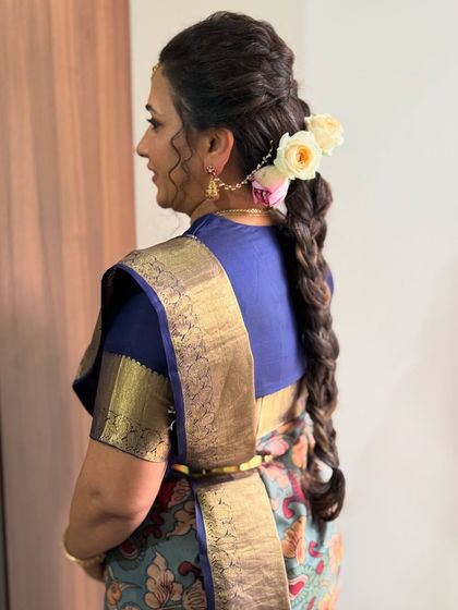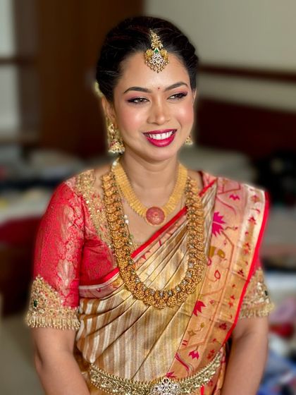 I do natural, long-lasting bridal makeup with airbrush if needed, plus custom hairstyles and saree draping for all wedding traditions and skin types.