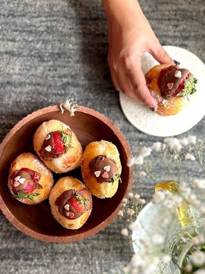 We specialize in artisanal bombolinis (filled doughnuts) available in unique flavors like Classic Chocolate, Crème Brûlée, Mango Thai Basil, and Chocolate Salted Caramel Honeycomb. Our mini bombolinis offer perfect bite-sized indulgence.