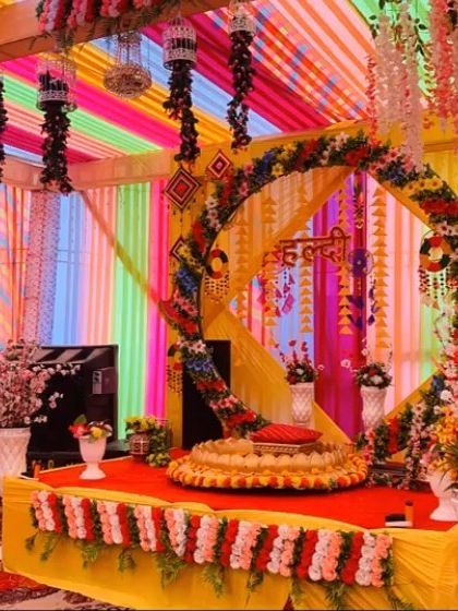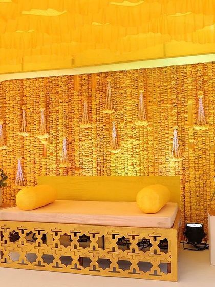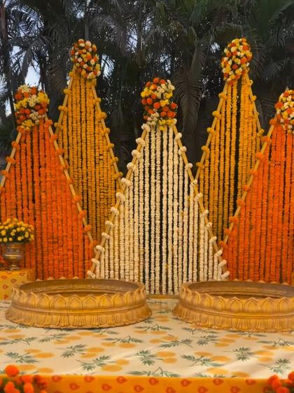 - My Haldi and Mehendi floral setups are full of marigold wedding decorations and bright colours. I use genda phool, pretty fabric drapes, and props like matkas, urlis, and umbrellas.