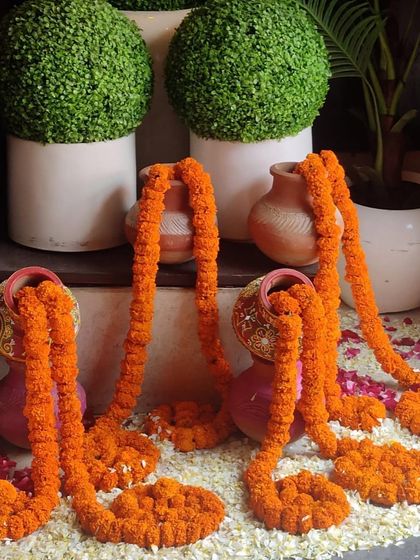 - Custom jaimalas for weddings, flower jewellery (necklaces, earrings, maang tikka) for the bride, and phoolon ki chadar for her entry.