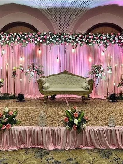 - Stages for engagement or reception are all about elegant backdrops, floral arrangements, and warm lighting.