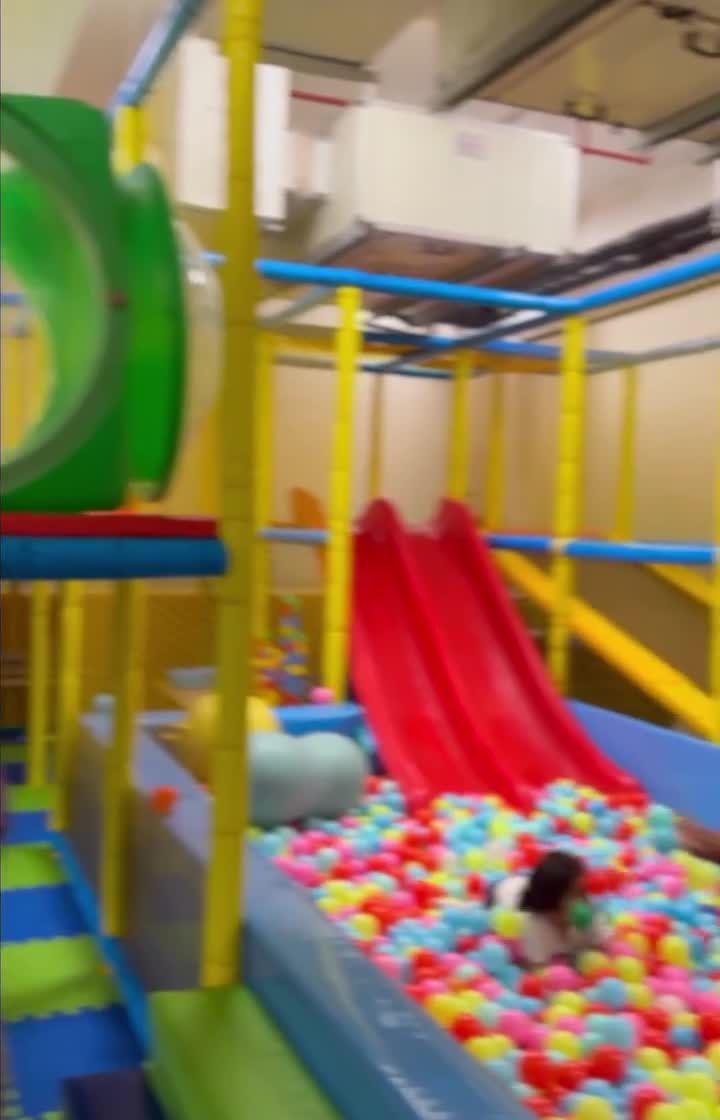 This is the core of our play area, a multi level soft play structure I designed for safe exploration. It features slides that lead into a massive ball pit, tunnels to crawl through, and various obstacles that encourage active, physical play for toddlers and young kids.