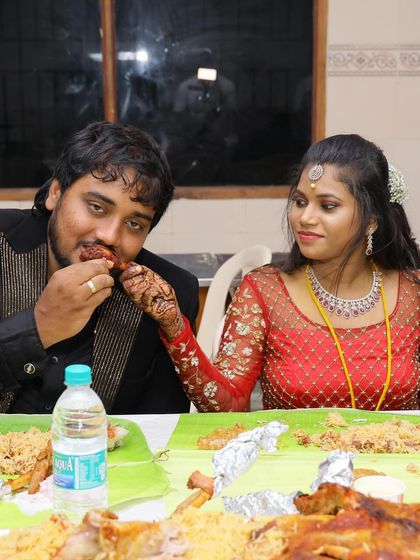 We offer a royal feast experience designed specifically for wedding celebrations. Our signature service includes traditional South Indian dishes served on banana leaves, featuring our renowned "Bhai Briyani," premium non-vegetarian delicacies, and an array of authentic accompaniments like chutneys and pachadi.