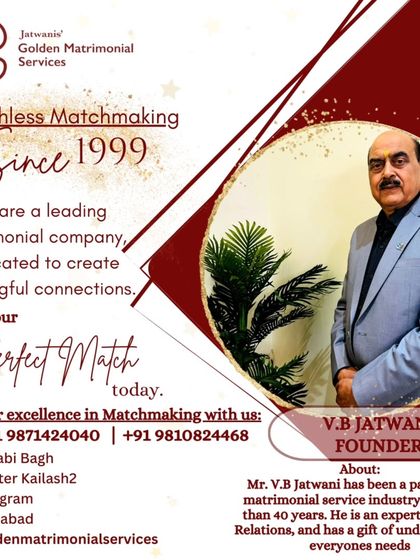 I’m V.B. Jatwani, founder of Golden Matrimonial Services. Been connecting people for 40+ years, started this in '99 after my PR days. I get it, everyone’s got their own story, own needs. Swiping apps, rishtedaar ka lectures – sab thak gaye hain (everyone’s tired). We’re like family, searching with heart, not just biodata. Seeing clients smile, that’s our reward. Universe plays its part, we just help nudge things along.