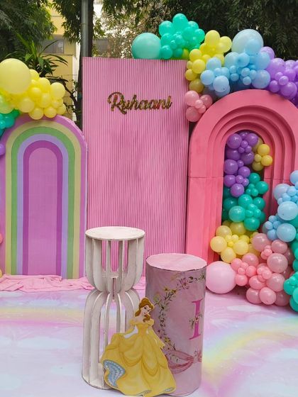 I create magical settings for your little one with themes like enchanted butterfly gardens, whimsical fairies, and classic princess castles. These setups feature custom props like large butterfly wings, light-up elements, and floral arrangements.