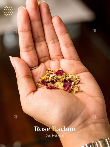 Discover my range of after-meal treats designed to aid digestion and refresh your palate. This includes crisps made from seasonal young turmeric and ginger, and our popular Rose Badam Mukhwas, a blend of roasted nuts, seeds, and fragrant petals.
