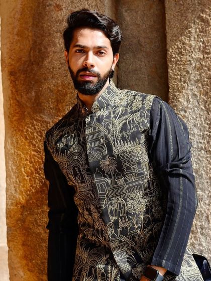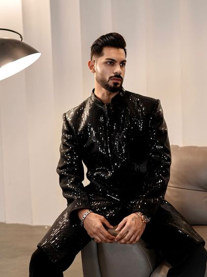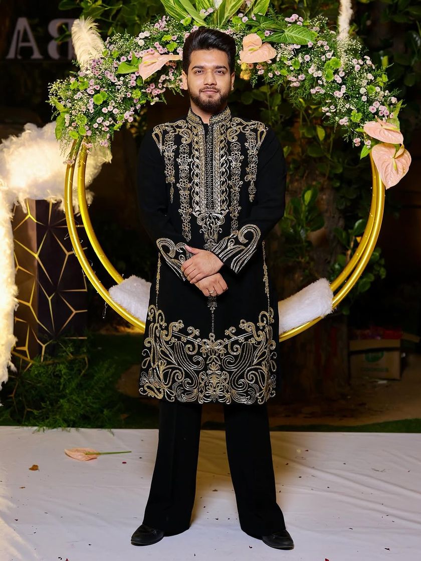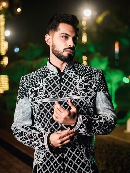 This collection is the cornerstone of our wedding and ceremonial wear. We create bespoke sherwanis and jackets featuring rich fabrics like velvet and silk, adorned with intricate hand-done Zari, threadwork, and metallic details for a truly majestic look.