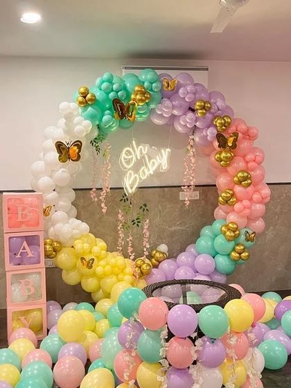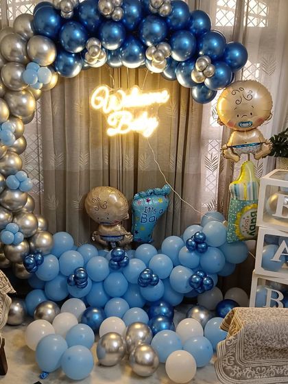 - Welcome home baby balloon setup that's either grand and full of cutouts or subtle and sweet with pastel balloon arches, neon signs, and those big "WELCOME BABY" letters.