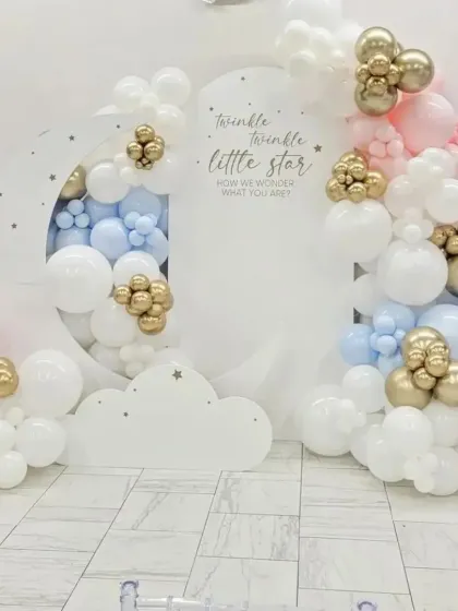 - Gender reveal party backdrop with pink and blue balloons, or something quirky like "Twinkle Twinkle Little Star" if you want to keep people guessing.