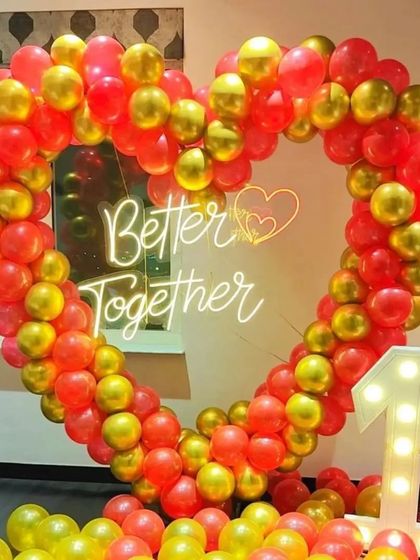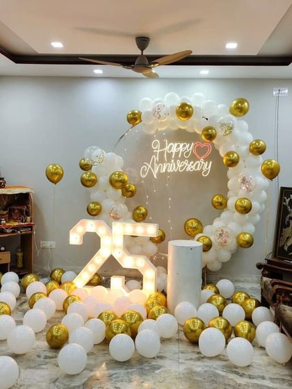 - Big or small anniversaries, I set up balloon rings, heart arches, and glowing “Happy Anniversary” signs. Milestone numbers light up for those special years.