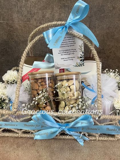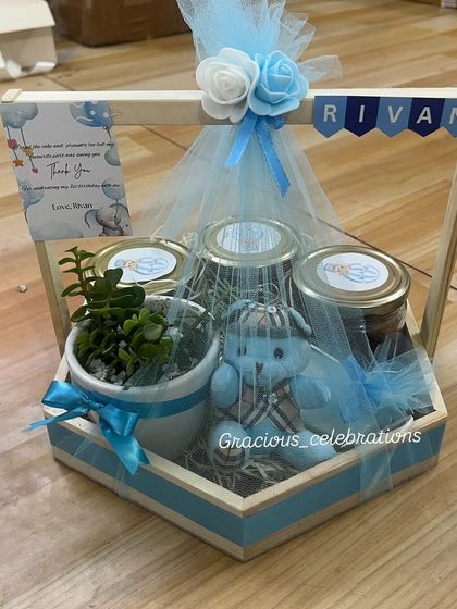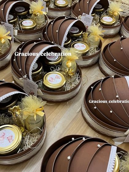 Pick from baskets, trays, luxury hamper packaging, or unique cradle/pram shapes for baby events. Fill them with treats like dry fruits, makhana, handmade soy candles (15+ scents), mugs, organizers, live plants, and more. I design everything around your theme - jungle, boho, sunflower, you name it - with custom tags and ribbons.