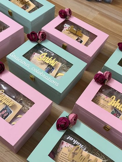 - Customized wedding hampers like mehndi favors, bridesmaid proposal boxes, and guest room treats.
