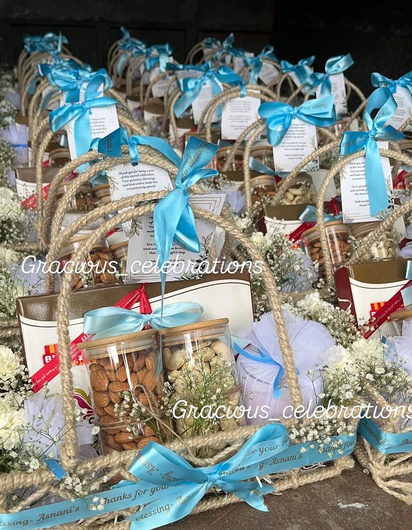 Celebrating your special moments shouldn't break the bank. This collection features a variety of my beautiful and thoughtful return favors, all available at affordable price points. ये सारे हैंपर्स आपके ओकेजन और थीम के हिसाब से कस्टमाइज हो सकते हैं।