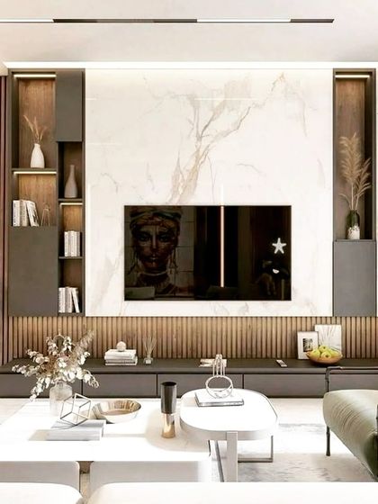 - Living/dining: Custom TV units, marble backsplashes, accent walls, and ceilings that make the space pop
