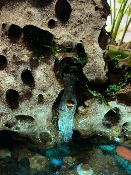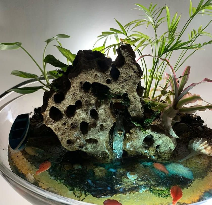 For a touch of unique charm, I create custom miniature dish gardens. These small ecosystems feature tiny, real running waterfalls, lush plants, and artistic details like a "resin sea" to bring a complete, tranquil waterscape to any small space.