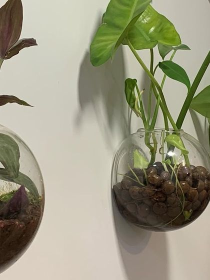 When floor space is limited, I use vertical gardening solutions to add greenery to your walls. From elegant glass terrariums and wall-mounted shelves to kokedama and trellises, these arrangements act as living art pieces.