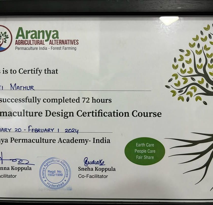 I am a certified Permaculture designer, and this philosophy of working with nature underpins all my projects. This training has provided me with the skills for sustainable design, soil health, and creating self-sufficient ecosystems, whether in a large farm or a small balcony.