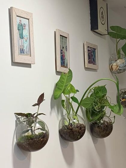 When floor space is limited, I use vertical gardening solutions to add greenery to your walls. From elegant glass terrariums and wall-mounted shelves to kokedama and trellises, these arrangements act as living art pieces.