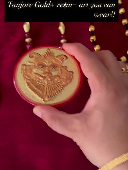 This is my signature collection, inspired by the grandeur of Tanjore paintings. I use traditional gesso work and real Tanjore gold foil, which is then sealed under resin to create these regal, durable pendants. Each piece features classic motifs like the mythical Gandaberunda bird or ornate floral patterns.