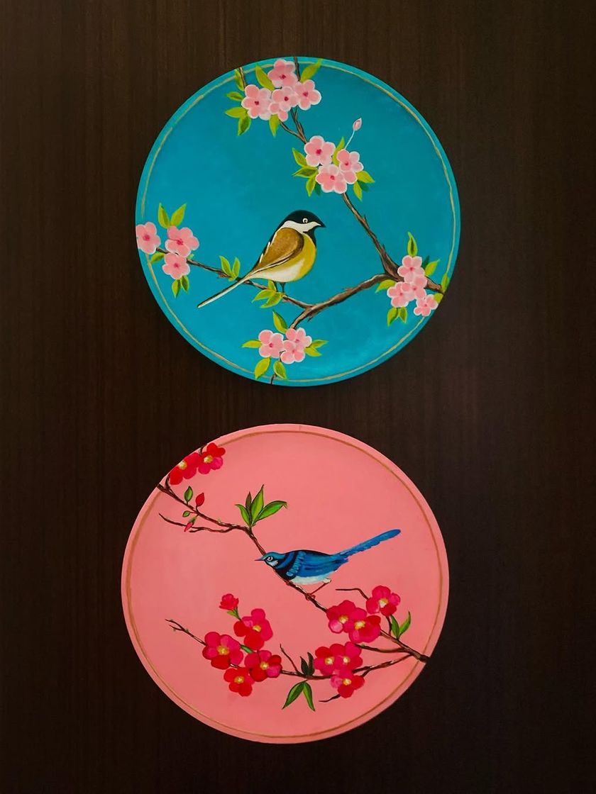 My love for nature, inherited from my father, comes alive in this collection of wall plates and decor. This series features everything from realistic birds and botanicals to imaginary plants inspired by ancient manuscripts, all painted by hand on wood.