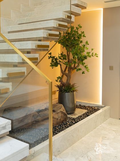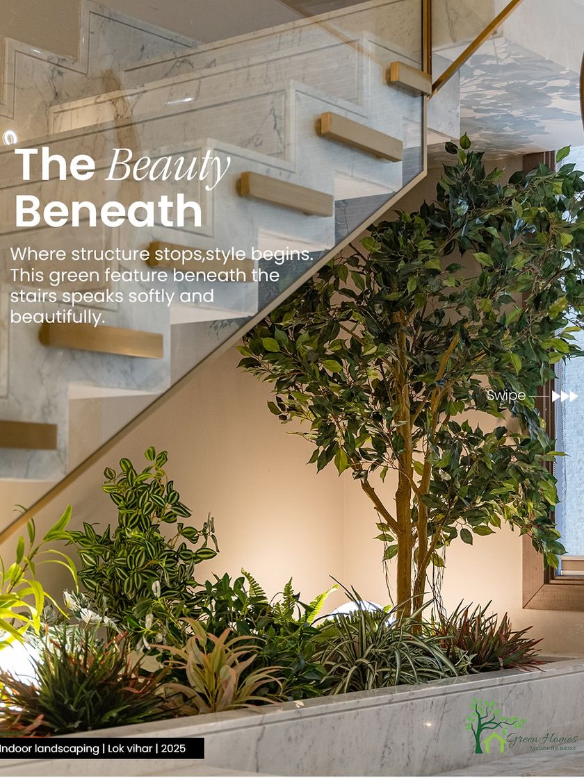 We specialize in transforming the often-overlooked space beneath a staircase into a stunning focal point. Our custom designs use a mix of artificial plants, rocks, pebbles, and integrated lighting to create a unique, maintenance-free garden that elevates your home's interior.