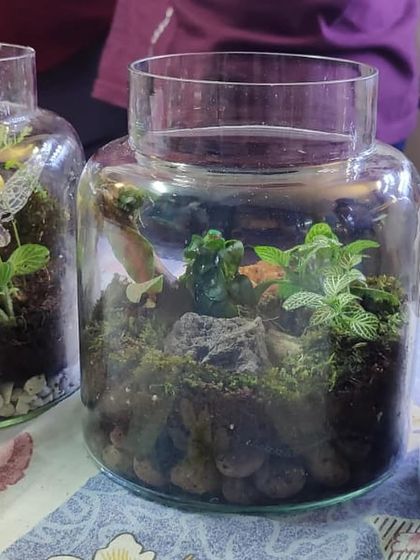 Explore the beautiful, tiny worlds you can build in our most popular terrarium workshops. We guide you through the entire process, from layering the foundation with soil and stones to arranging plants and adding decorative miniatures like houses, fairies, or serene statues.