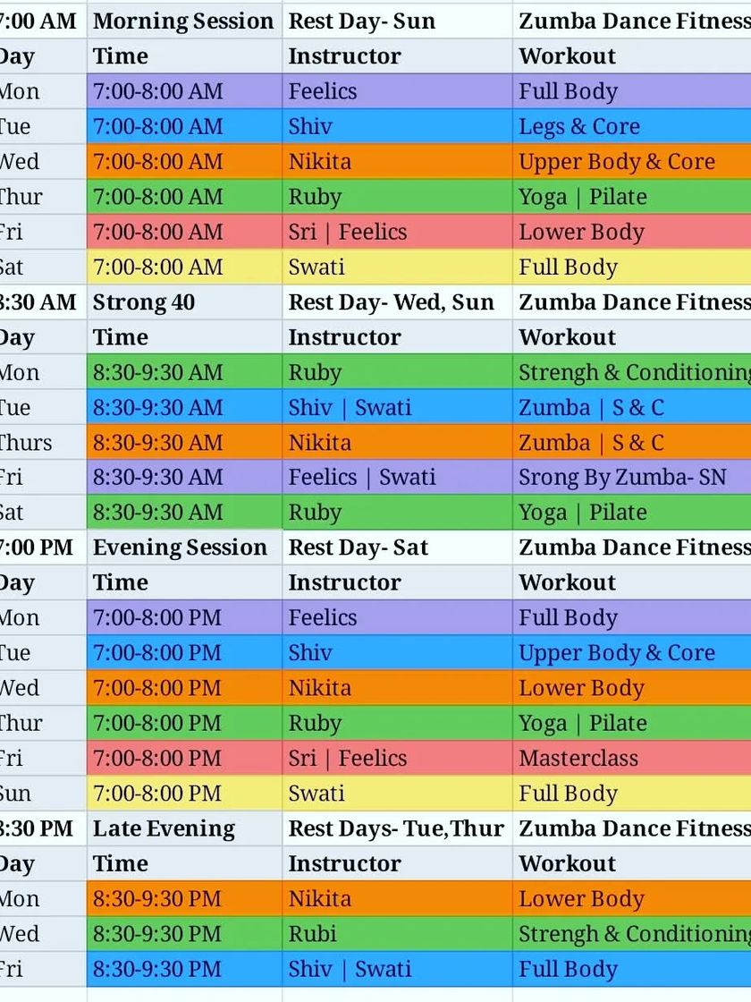 Find a class that fits your life. We run 11 live batches from 5 AM to 9 PM, covering Zumba, Yoga, and Strength Training. Here you can find our latest schedules and announcements for new batches and special events.