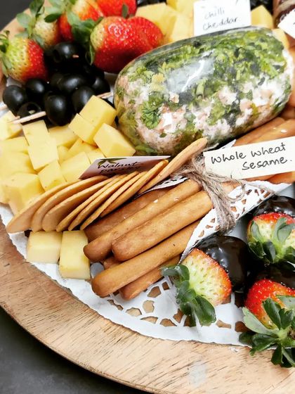 - Cheese Board Gifts: Cream cheese logs and balls in flavours like Paprika Garlic or Cranberry Pistachio, with homemade artisanal crackers, fresh fruit, nuts, and olives.