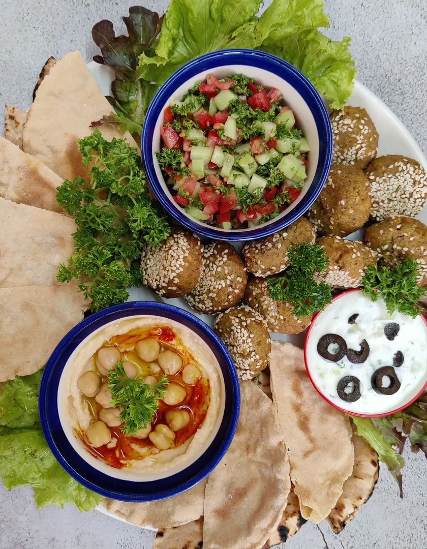 Experience the best of Middle Eastern flavors with our 100% vegetarian Mezze platters. Everything is made fresh in our kitchen, including the crispy falafel, soft pita, and our signature trio of homemade dips.