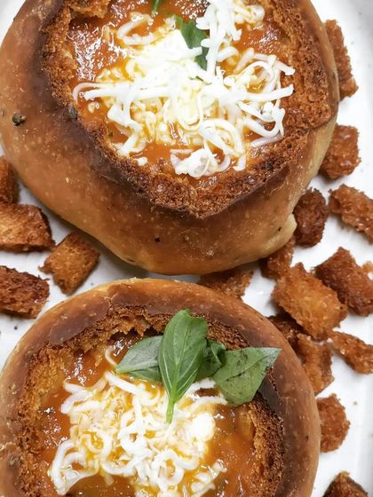 We create comforting and cheesy vegetarian classics from Italian and Continental cuisines. Our menu features dishes like baked lasagna, creamy pastas, hearty soups in bread bowls, and a variety of fresh dips like hummus and whipped feta.