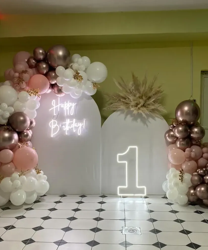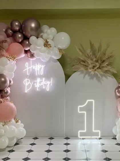 A baby's first birthday is a once-in-a-lifetime event, and we make it unforgettable. We offer a wide variety of themes, from popular cartoons to elegant custom designs, complete with personalized backdrops, balloon arches, and light-up marquee numbers.