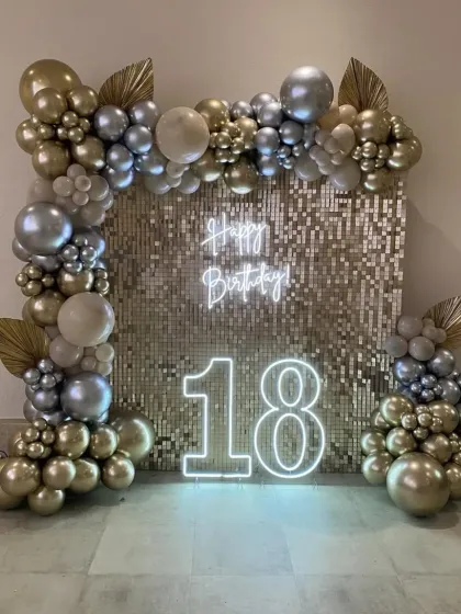 For teens and adults, I design stylish and sophisticated decorations perfect for milestone birthdays like the 18th, 21st, 40th, or 60th. These setups often include glamorous sequin walls, custom neon signs, marquee numbers, and elegant balloon arrangements in trendy color palettes like black and gold, pastels, or monochrome.