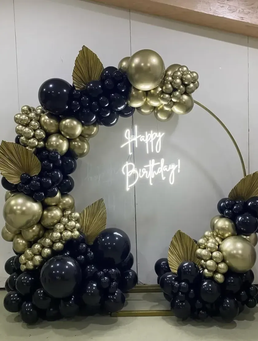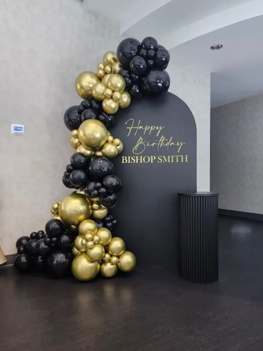 I create stunning photo-booth backdrops perfect for birthdays, anniversaries, and parties. These setups feature shimmering sequin walls, custom neon signs, and elaborate balloon garlands in a variety of color schemes like monochrome, metallic, and pastels.