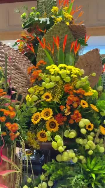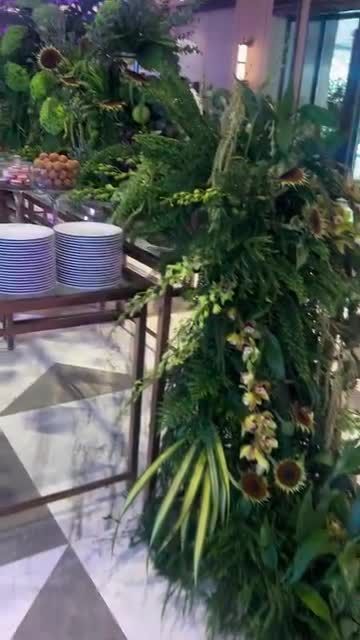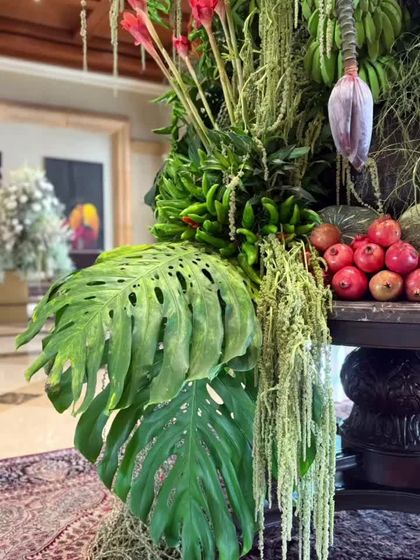 My work extends beyond tables to creating large scale, living art installations for spaces like hotel lobbies and grand entrances. I use a mix of tropical leaves, seasonal blooms, and even fruits and vegetables to build breathtaking structures that transform an environment and make a lasting first impression. This collection showcases a variety of themes, from vibrant and colorful to serene and green.