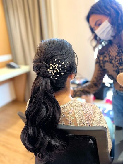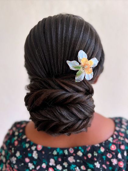 Bridal hairstyling & saree draping - I do South Indian bridal hairstyles, intricate braid styling, and signature saree draping for weddings.