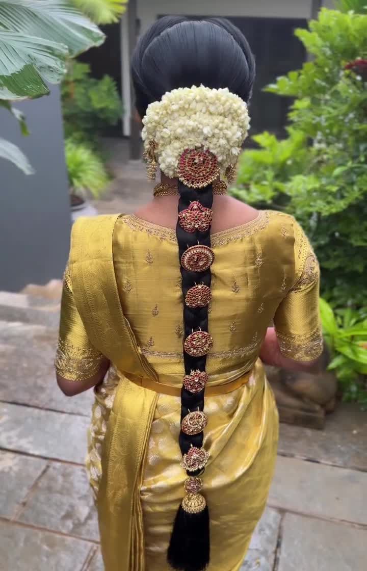 My specialty lies in creating timeless South Indian bridal looks, especially for the Muhurtham ceremony. I design everything from the classic Poola Jada with fresh jasmine and temple jewellery (Jada Billai) to other traditional braid styles, ensuring every bride feels divine on her special day.