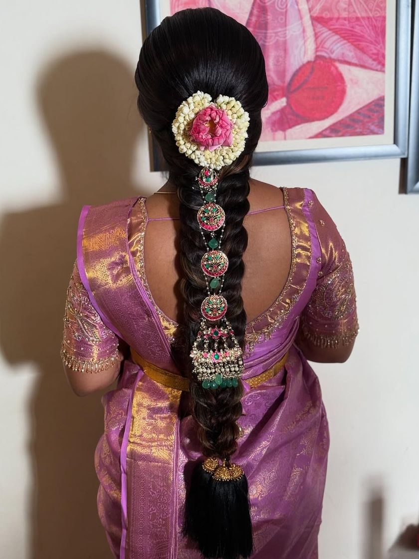 Master the art of the classic South Indian bridal braid, a cornerstone of our culture and my specialty. In my course, you will learn everything from neat sectioning and braid weaving to securely fixing traditional accessories like *jadanagam*, *kuchu* (tassels), and fresh flowers for a flawless finish.