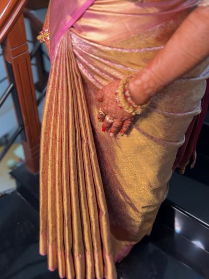 I come to your venue and drape any saree style you want, making sure the pleats stay neat and the drape holds up all day, even with heavy silks.