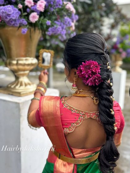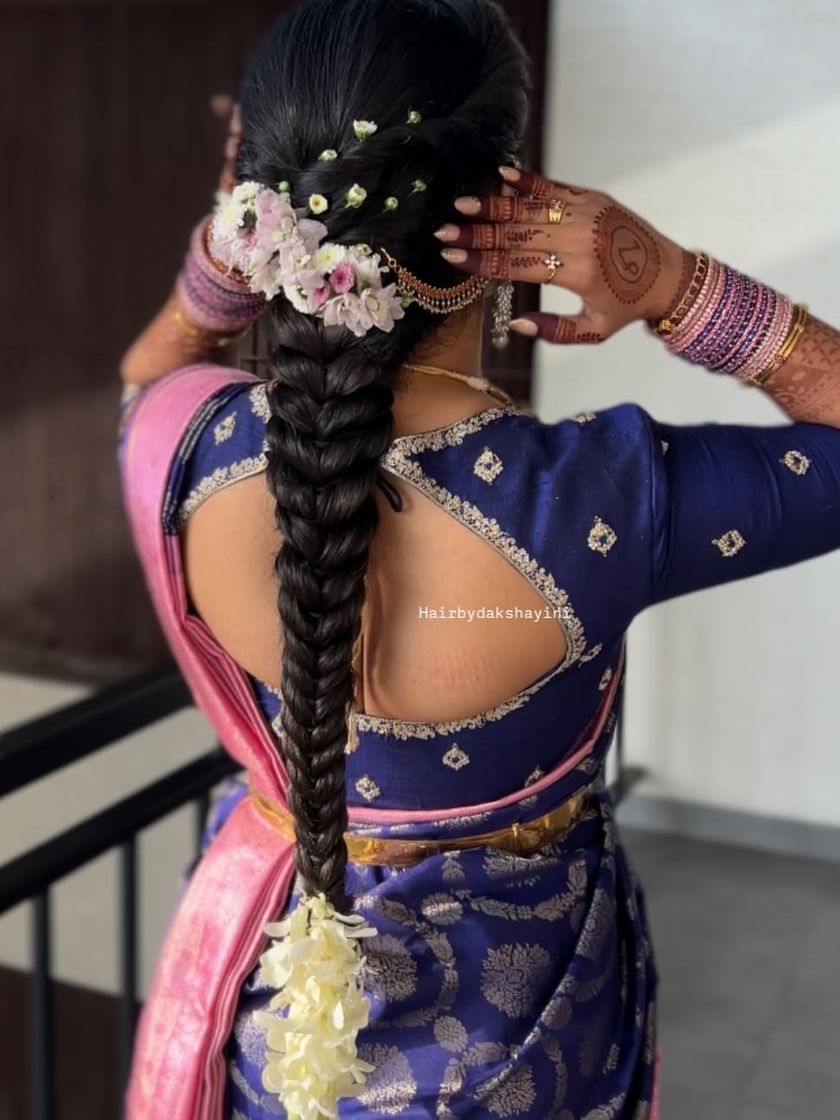 While saree draping is my passion, I am also a professional hairstylist. A great hairstyle is essential to complete the look, and I offer a range of styles from traditional braids and buns to modern open hairstyles.