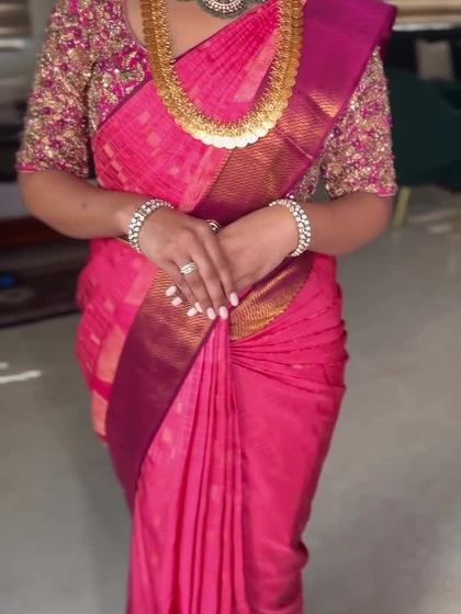 I specialize in draping heavy Kanchipuram and other silk sarees for the main wedding ceremony. My focus is on creating sharp, defined pleats and a secure pallu that stays perfect from the first ritual to the last, allowing you to move with confidence.