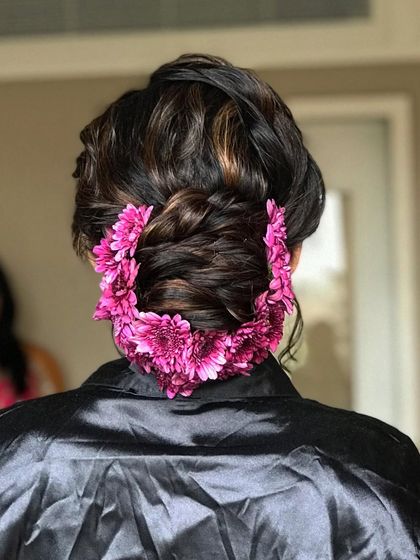 I create bridal hairstyles for all wedding events, from classic updos and traditional braids to modern open hair looks, using fresh flowers and custom accessories to match your style and culture.