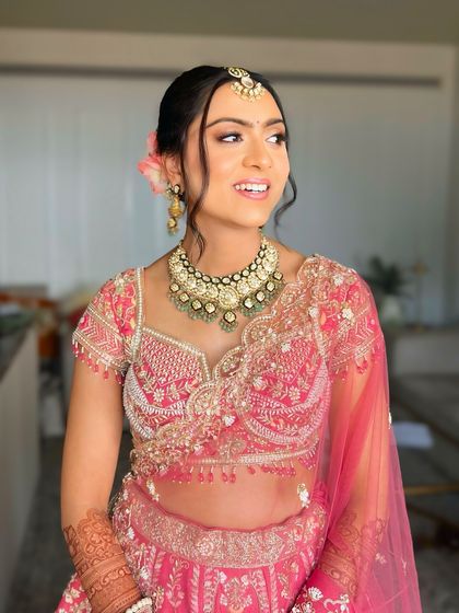 For clients who want a statement look, I love creating intricate hairstyles featuring detailed braiding and unique accessories. This includes traditional Punjabi parandi braids, modern pull-through braids, and styles adorned with custom hair jewelry for a truly personalized touch.
