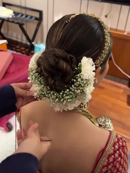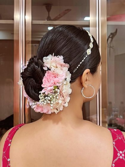Your wedding day hairstyle should be nothing short of perfection. I create a variety of bridal buns, from sleek and classic styles adorned with gajra to intricate, textured updos with fresh flowers, ensuring your look is timeless and holds perfectly through the ceremony.