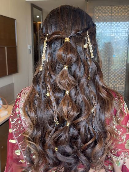 - Sangeet & Cocktail: Time to glam up - think glamorous sangeet hairstyles like high ponytails with volume, Hollywood waves, and soft updos with sparkly accessories.