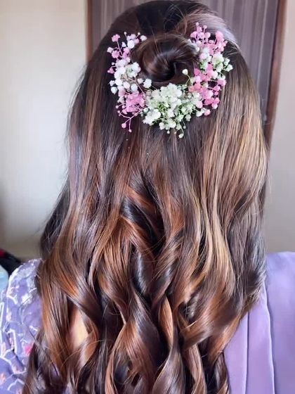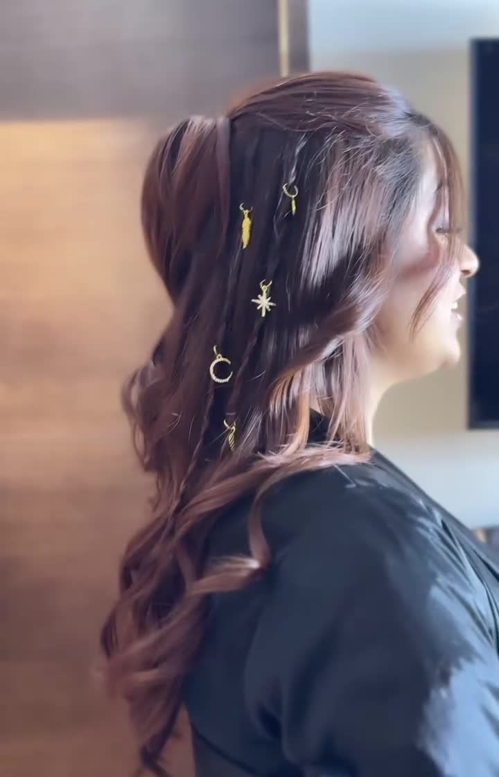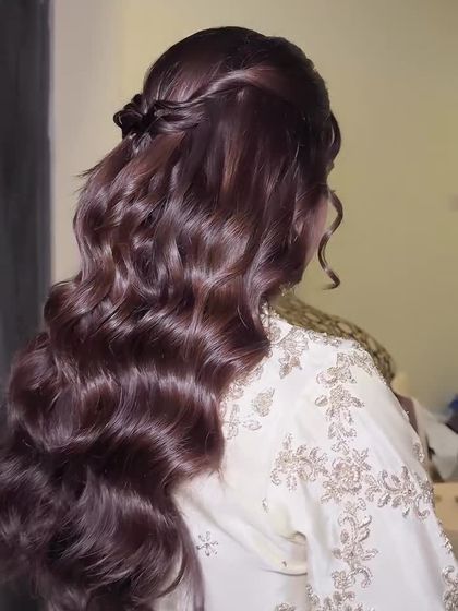 Perfect for Sangeet, Cocktail, or Engagement parties, these styles let you keep your hair open while looking polished. I create everything from glamorous Hollywood waves to soft, romantic curls and textured beach waves, often in half-up styles decorated with minimal accessories.