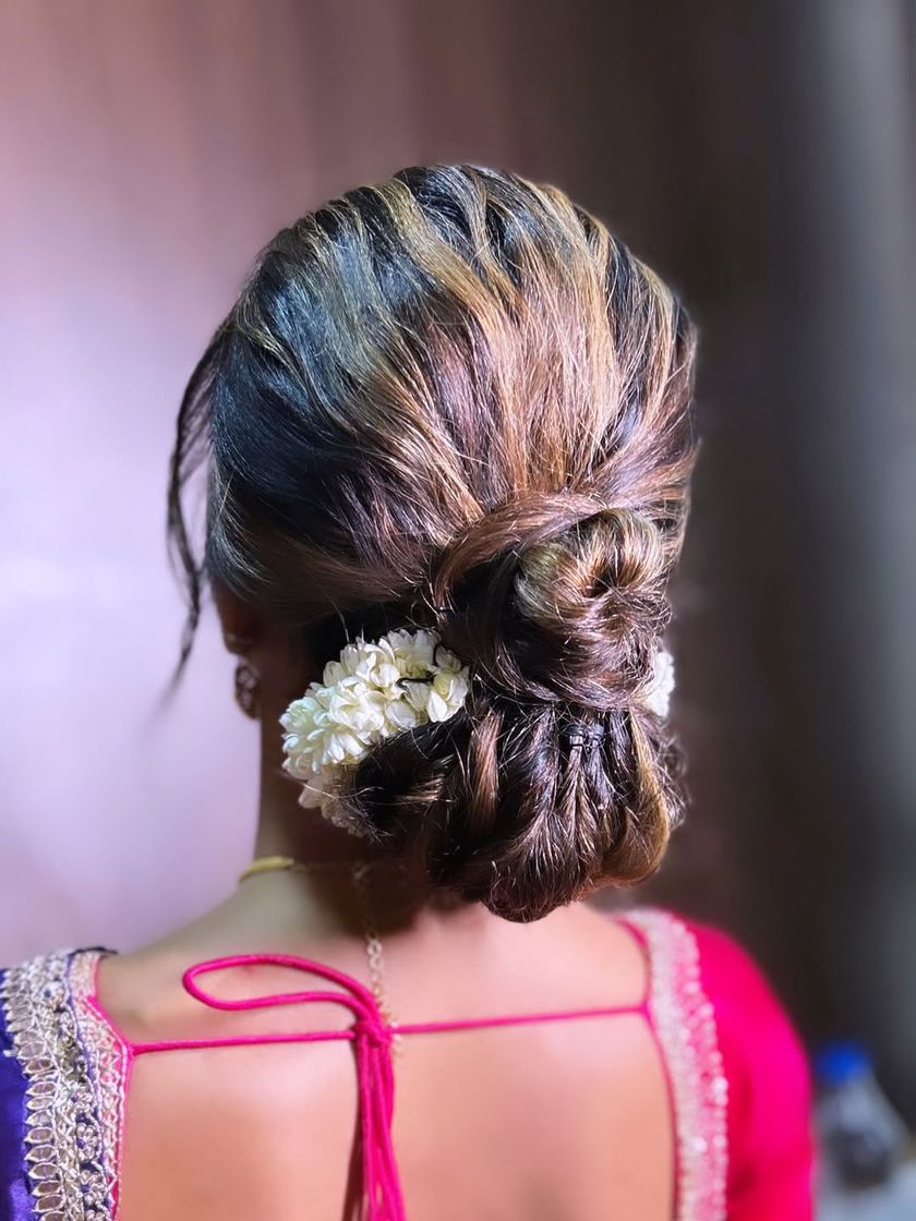 This is my specialty, the classic South Indian bridal braid. I create these looks using techniques to maximize length and volume, often with high-quality extensions, and adorn them with your choice of fresh flowers like jasmine gajras or traditional gold-plated jewellery like jada billai.