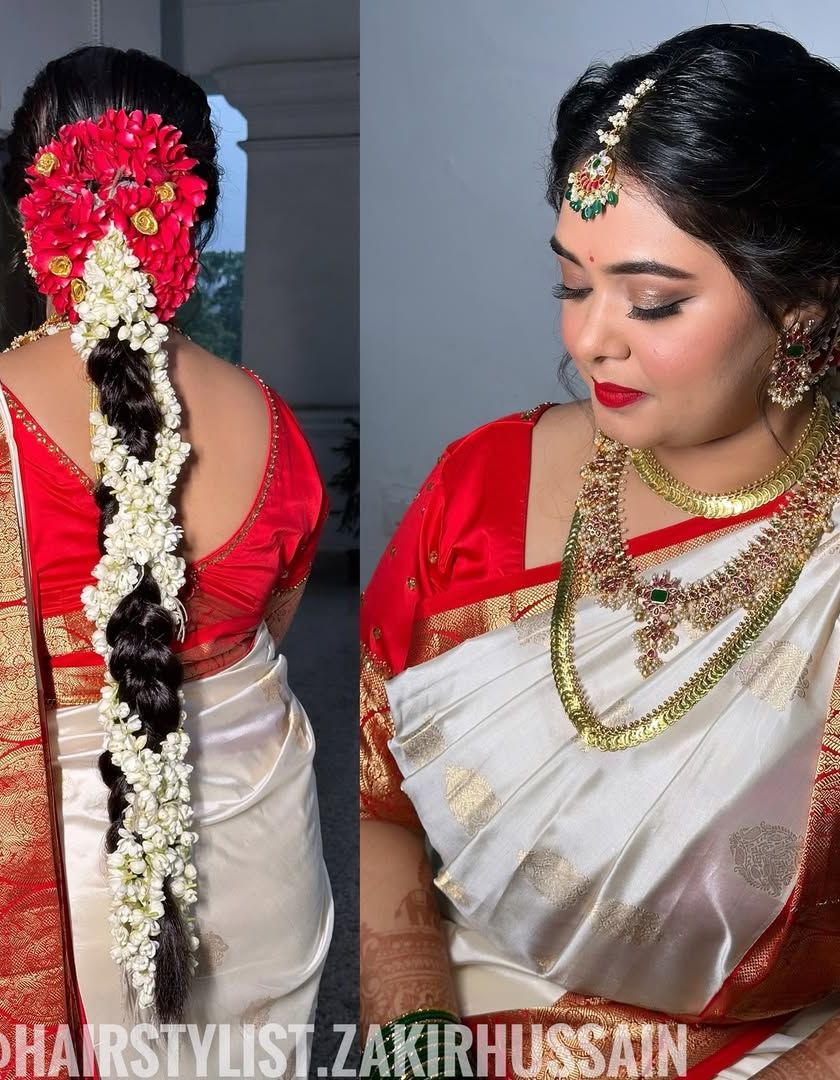 I specialize in creating authentic South Indian bridal hairstyles, including the traditional 'Poola Jada'. These styles involve crafting a long, thick braid and decorating it with intricate arrangements of fresh flowers like jasmine and roses, along with classic temple jewelry hair accessories.