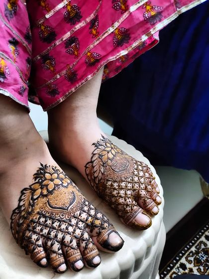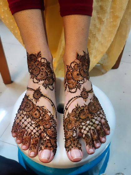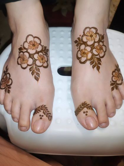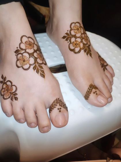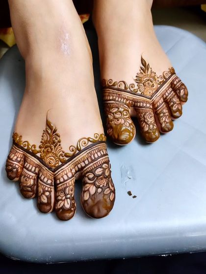 I specialize in creating intricate foot mehndi designs featuring symmetrical patterns that beautifully cover the top of feet and toes. My designs incorporate traditional elements like florals and geometric shapes, ensuring a rich, dark stain that lasts.