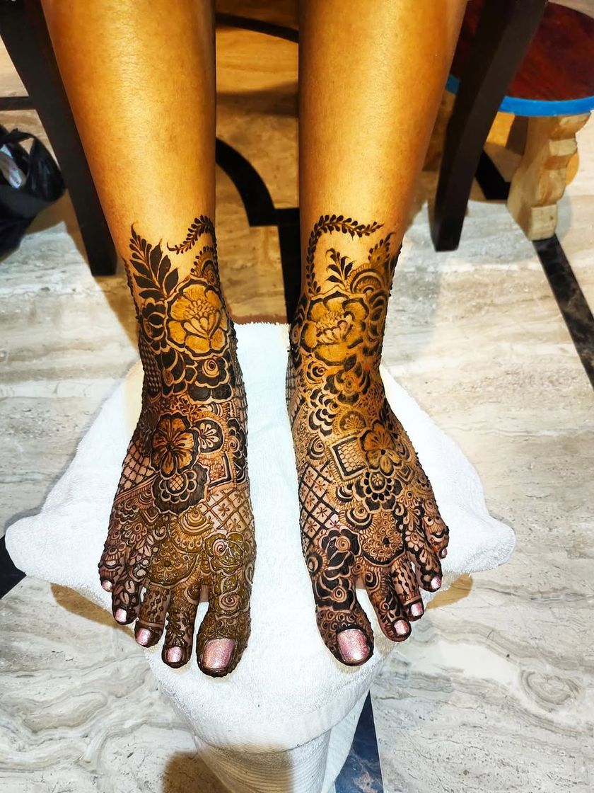 Don't forget the feet! I create beautiful and intricate designs for feet and legs, ranging from simple patterns for guests to full coverage for brides, ensuring your look is complete and stunning from head to toe.